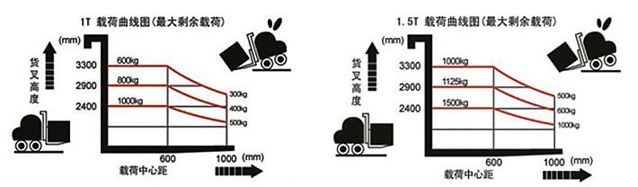 注意:半電動(dòng)液壓堆高車,須按照堆高車的載荷曲線圖鎖允許的剩余載荷進(jìn)行操作(如下圖),嚴(yán)禁超載使用,確保安全.